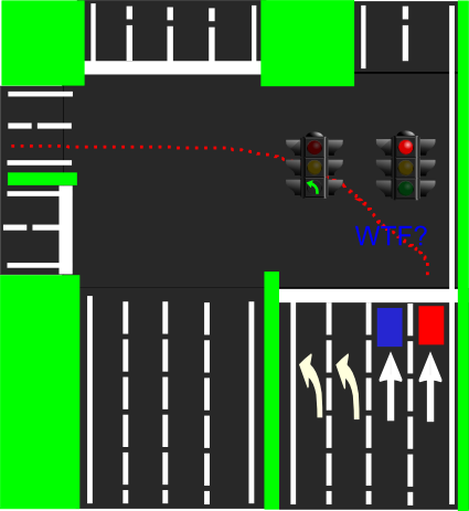 Nope, that wasn’t what she had in mind. While the light was red, she drove forward into the intersection, slashed in front of me, and attempted to barge into the rightmost turning lane. It was full, so she had to wait until the green arrow was past red before she could make the turn. At that point my light turned green, but since she was stuck in the intersection and blocking my lane, I had to wait for her before I could move.
